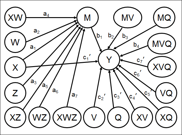 ! Latent moderators W, Z, V, and Q, each measured by sets of 4 observed variables W1-W4, Z1-Z4, V1-V4, and Q1-Q4 respectively