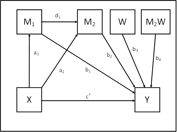 Mplus code for mediation, moderation, and moderated mediation modelsModel 87: 2 or more mediators in series, 1 moderator, moderating the second mediator-DV path Example Variables: 1 predictor X, 2 mediators M1 and M2, 1 moderator W, 1 outcome Y Preliminary notes: The code below assumes that