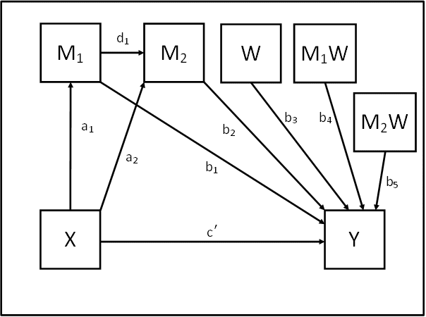 Mplus code for mediation, moderation, and moderated mediation modelsModel 88: 2 or more mediators in series, 1 moderator, moderating both the first mediator-DV and the second mediator-DV paths Example Variables: 1 predictor X, 2 mediators M1 and M2, 1 moderator W, 1 outcome Y Preliminary notes: The code below assumes that