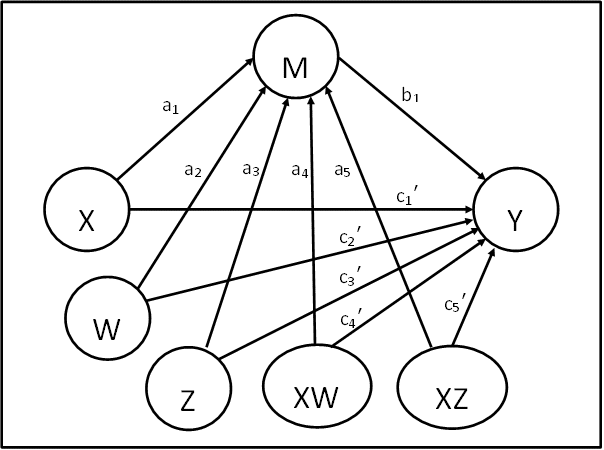Y = b0 + b1M + c1'X + c2'W + c3'Z + c4'XW + c5'XZ