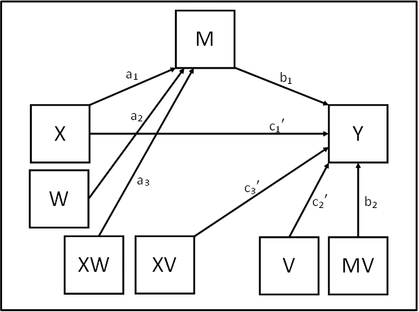 Mplus code for mediation, moderation, and moderated mediation modelsModel 28: 1 or more mediators, in parallel if multiple (example uses 1), 2 moderators, 1 moderating the IV-Mediator path, 1 moderating the Mediator-DV path and direct IV-DV path Example Variables: 1 predictor X, 1 mediator M, 2 moderators W, V, 1 outcome Y Preliminary notes: The code below assumes that