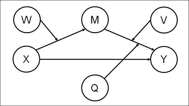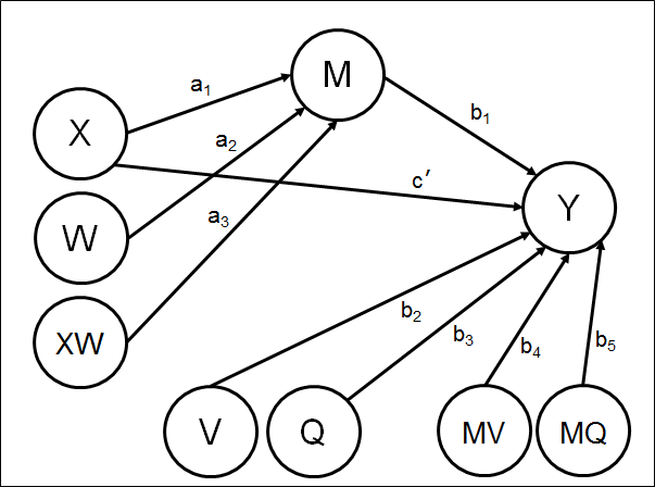 ! Latent moderators W, V, and Q, each measured by sets of 4 observed variables W1-W4, V1-V4, and Q1-Q4 respectively