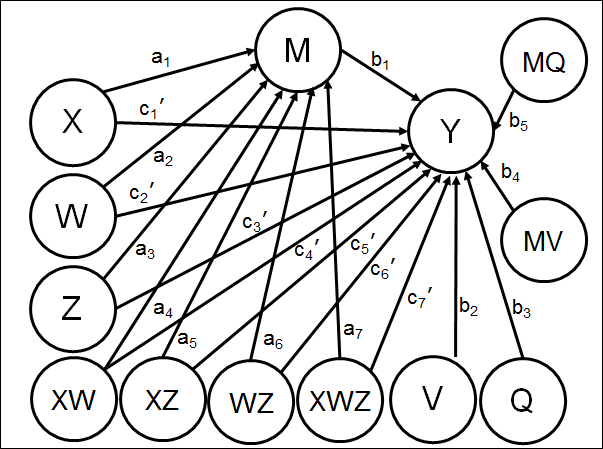! Latent moderators W, Z, V, and Q, each measured by sets of 4 observed variables W1-W4, Z1-Z4, V1-V4, and Q1-Q4 respectively