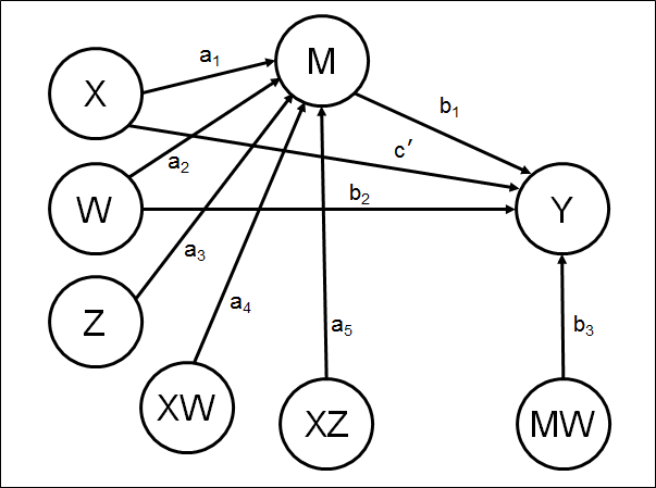 ILOW_LOZ = a1*b1 + a4*b1*LOW_W + a5*b1*LOW_Z + a1*b3*LOW_W +     ILOW_MEZ = a1*b1 + a4*b1*LOW_W + a5*b1*MED_Z + a1*b3*LOW_W +     ILOW_HIZ = a1*b1 + a4*b1*LOW_W + a5*b1*HIGH_Z + a1*b3*LOW_W + ! Calc conditional total effects for each combination of moderator values