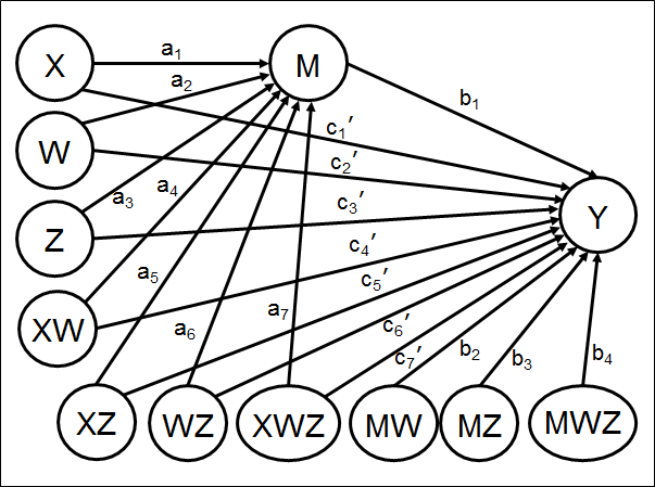 ! Latent moderators W and Z, each measured by sets of 4 observed variables W1-W4 and Z1-Z4 respectively
