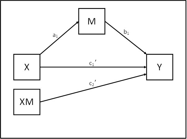 Mplus code for the mediation, moderation, and moderated mediation model templates from Andrew Hayes' PROCESS analysis examplesModel 74: 1 or more mediators, in parallel if multiple (example uses 1), IV also moderates the Mediator-DV path Example Variables: 1 predictor X, 1 mediator M, 1 outcome Y Preliminary notes: The code below assumes that