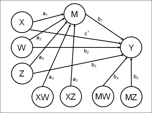 Y = b0 + b1M + b2W + b3Z + b4MW + b5MZ + c'X
