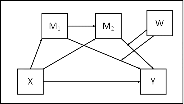Mplus code for mediation, moderation, and moderated mediation modelsModel 88: 2 or more mediators in series, 1 moderator, moderating both the first mediator-DV and the second mediator-DV paths Example Variables: 1 predictor X, 2 mediators M1 and M2, 1 moderator W, 1 outcome Y Preliminary notes: The code below assumes that