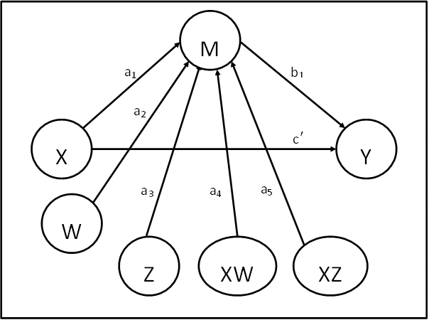 Y = b0 + b1(a0 + a1X + a2W + a3Z + a4XW + a5XZ) + c'X